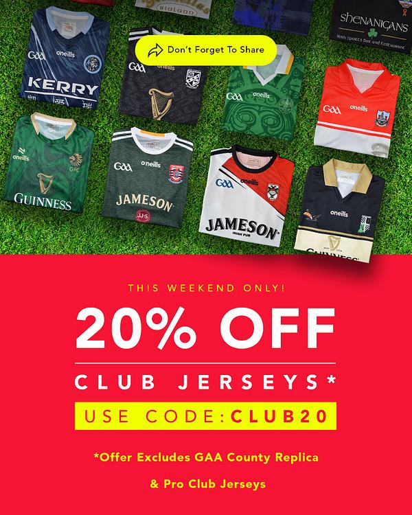 Hi everyone. ONeills have announced a 20% off offer on club replica jerseys and club vests starting tomorrow and ending midnight Sunday
